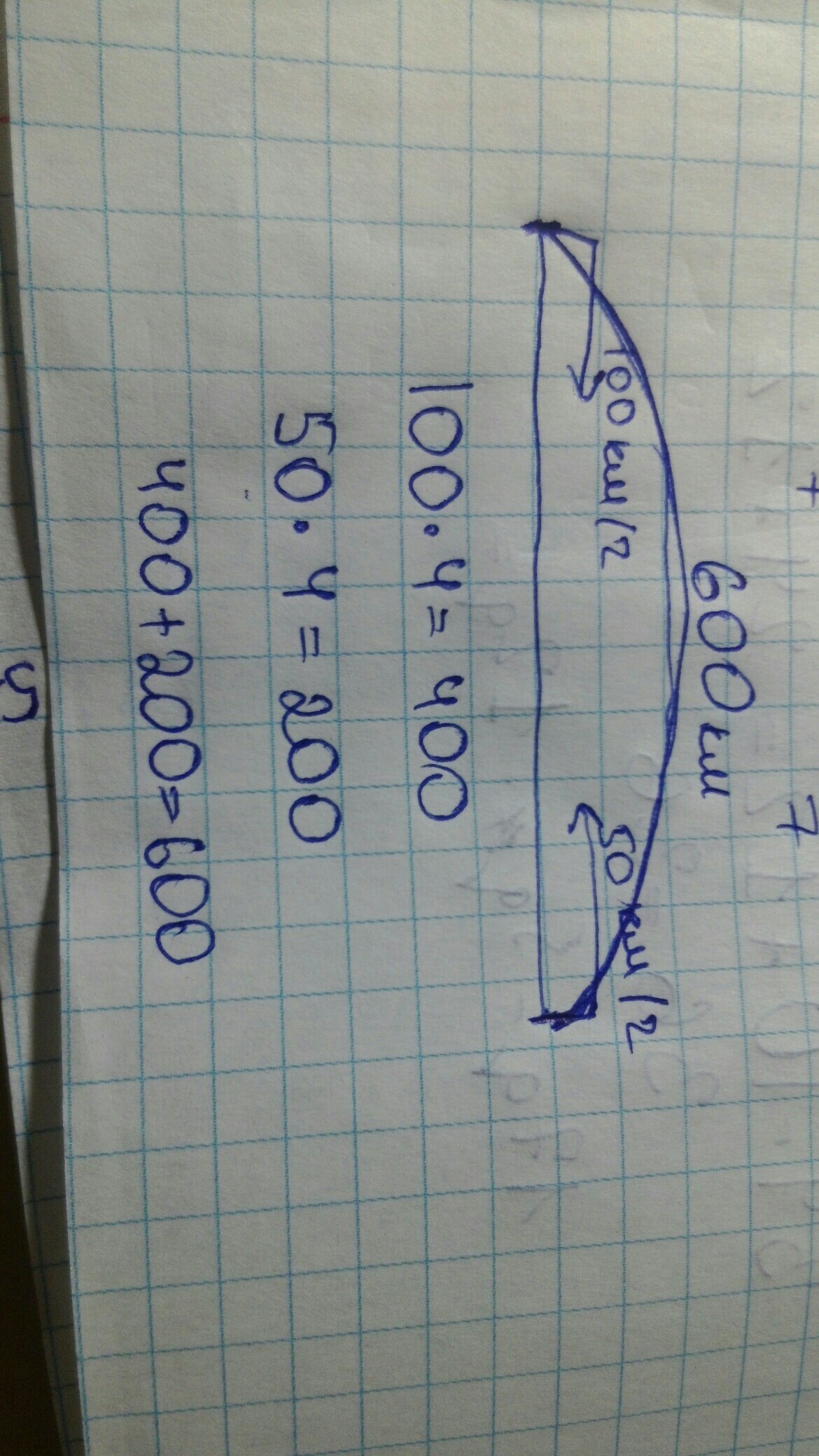 Место встречи поездов если один едет со скоростью 100км/ч, а другой 50км/ч. При этом между ними 600км