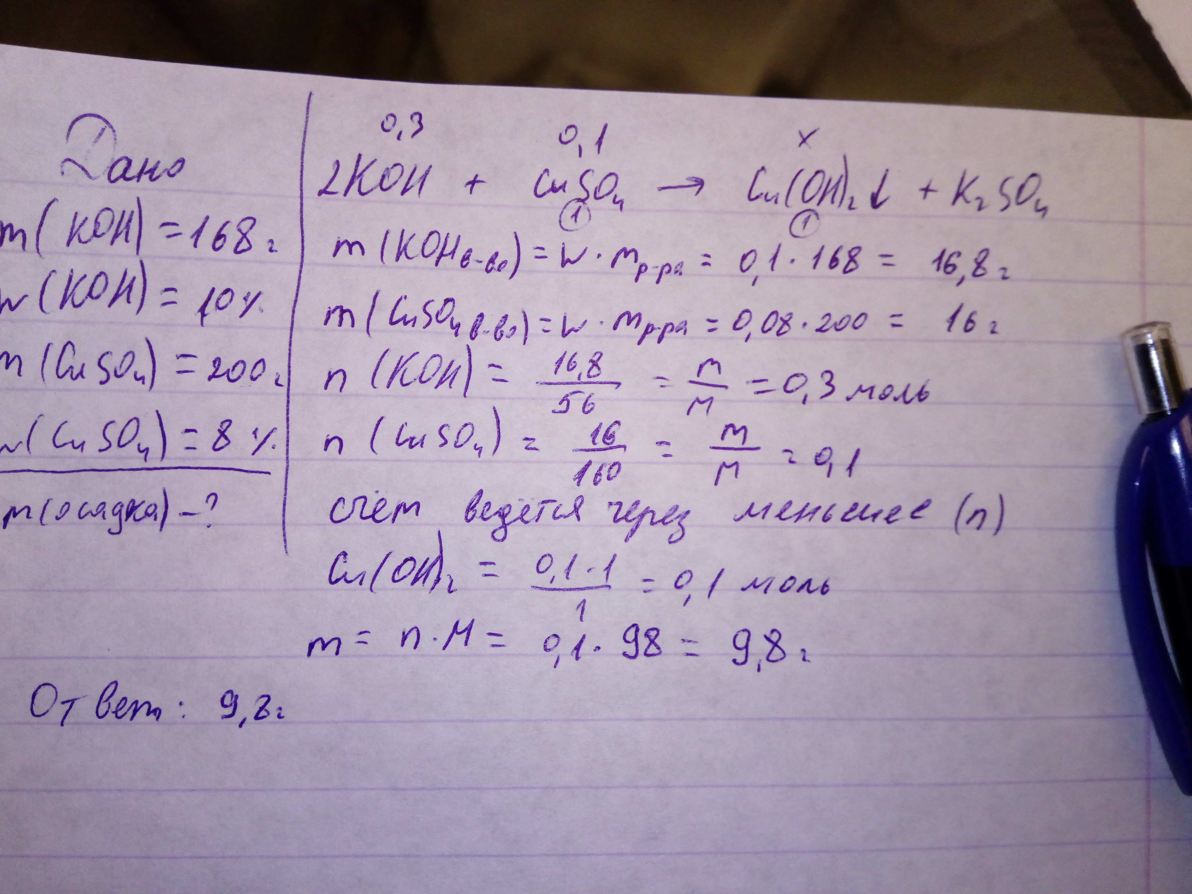 СРОЧНО!!!!!Задача:при взаимодействии 168 г гидроксида калия с массовой долей КОН 10% и раствора сульфата меди (ll) массой 200г, в котором 0,08 массовых долей соли , выпадает осадок . Определите массу осадка.( с условием пожалуйста)