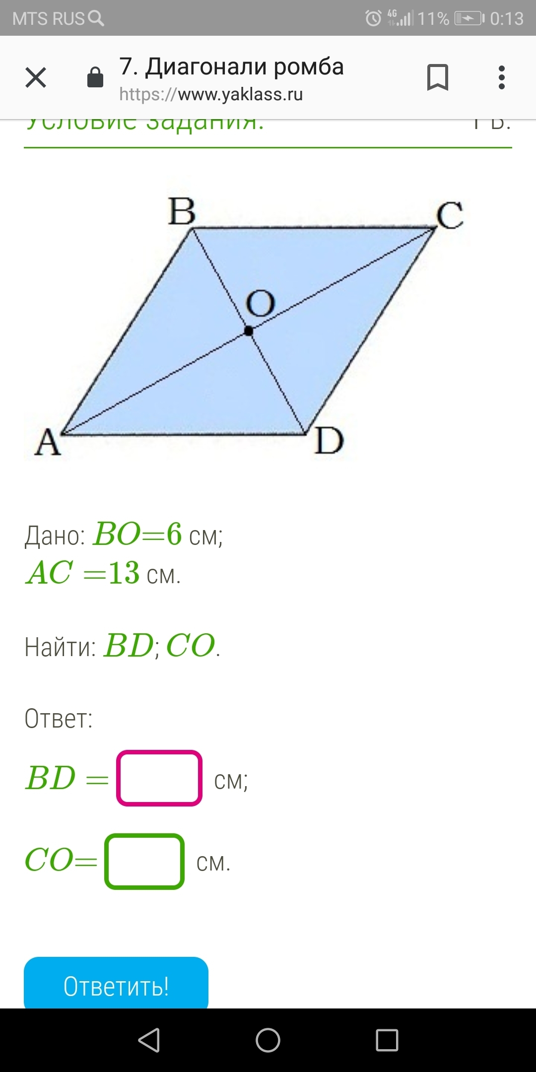 Т.к диагонали ромба точкой пересечения делятся пополам.
