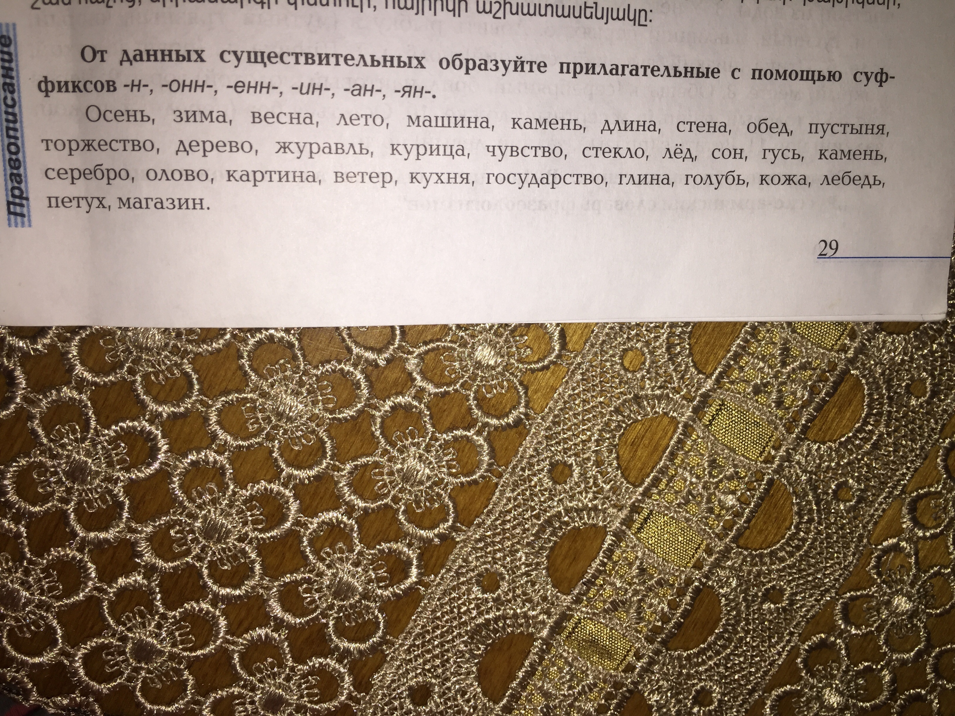 От данных существительных образуйте прилагательные с помощью суффиксов -н-, -онн-, -енн-, -ин-,-ан-,-ян-.