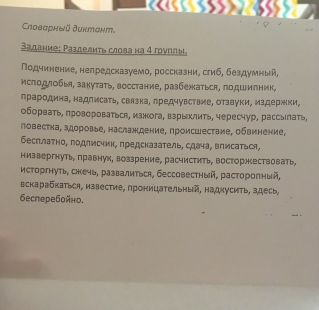 на какие 4 группы можно разделить слова: подчинение, непредсказуемо, россказни, сгиб, бездумный, исподлобья, закутать, восстание, разбежаться, подшипник, прародина, надписать, связка, предчувствие, отзвуки, издержки, оборвать, провороваться, изжога, взрыхлить, чересчур, рассыпать, повестка, здоровье, наслаждение, происшествие, обвинение, бесплатно, подписчик, предсказатель, сдача, вписаться, низвергнуть, правнук, воззрение, расчистить, восторжествовать, исторгнуть, сжечь, развалиться, бессовестный, расторопный, вскарабкаться, известие, проницательный, надкусить, здесь, бесперебойно?