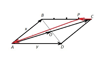В параллелограмме ABCD на стороне BC взята точка P так,что BP:PC=3:1,O-точка пересечения диагоналей.Выразите вектор AO и PA через векторы x=AB и y=AD