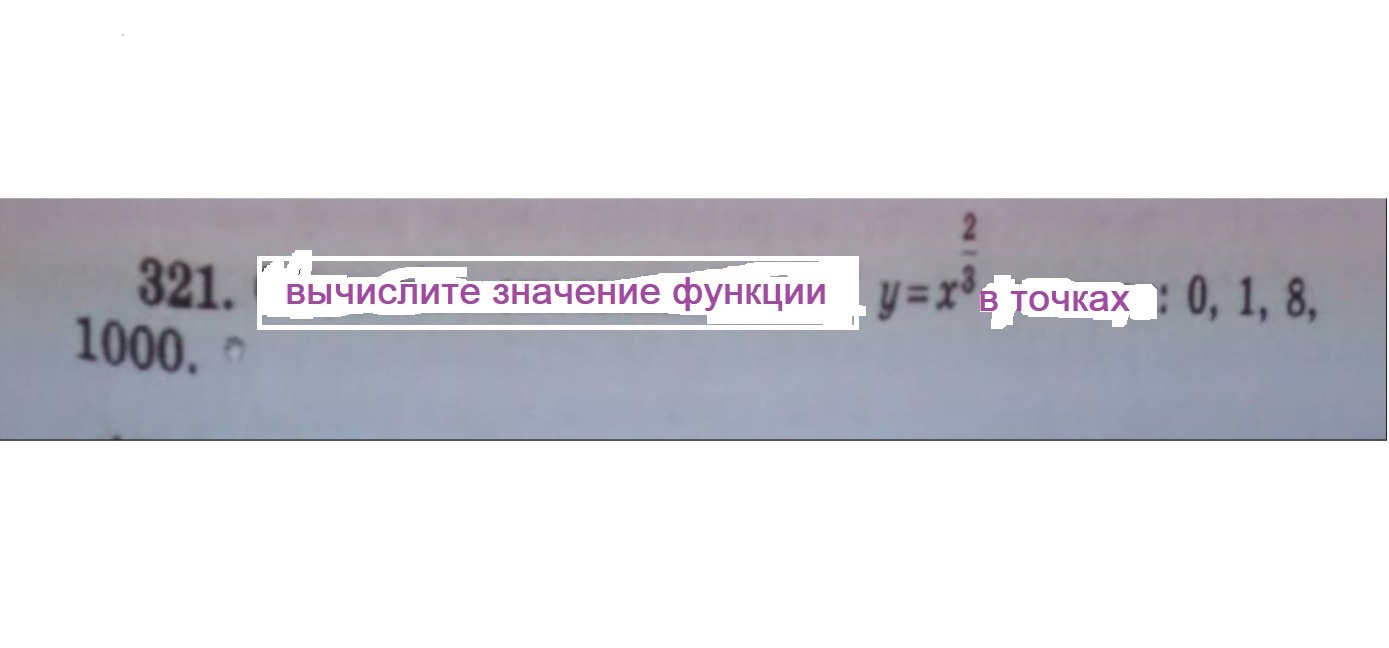 x=0, y=0^2/3=0; x=1, y=1^2/3=1; x=8, y=8^2/3=(8^2)^1/3=(64)^1/3=4; x=1000, y=(1000)^2/3=(1000^2)^1/3= ((10^3)^2))^1/3=(10^6)^1/3=10^2=100. ^- это степень. я так думаю.