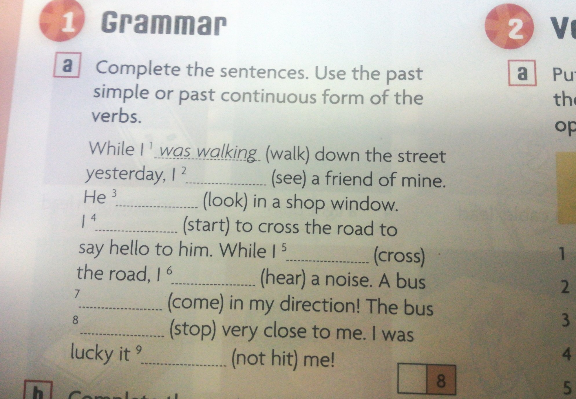 2 saw 3 was looking 4 started 5 was crossing 6 heard 7 was coming 8 stopped 9 didn't hit