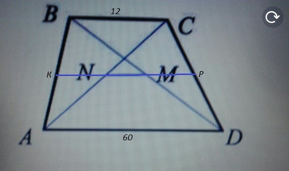 Основания трапеции равны 12 и 60 . Найдите отрезок, соединяющий середины диагоналей трапеции.