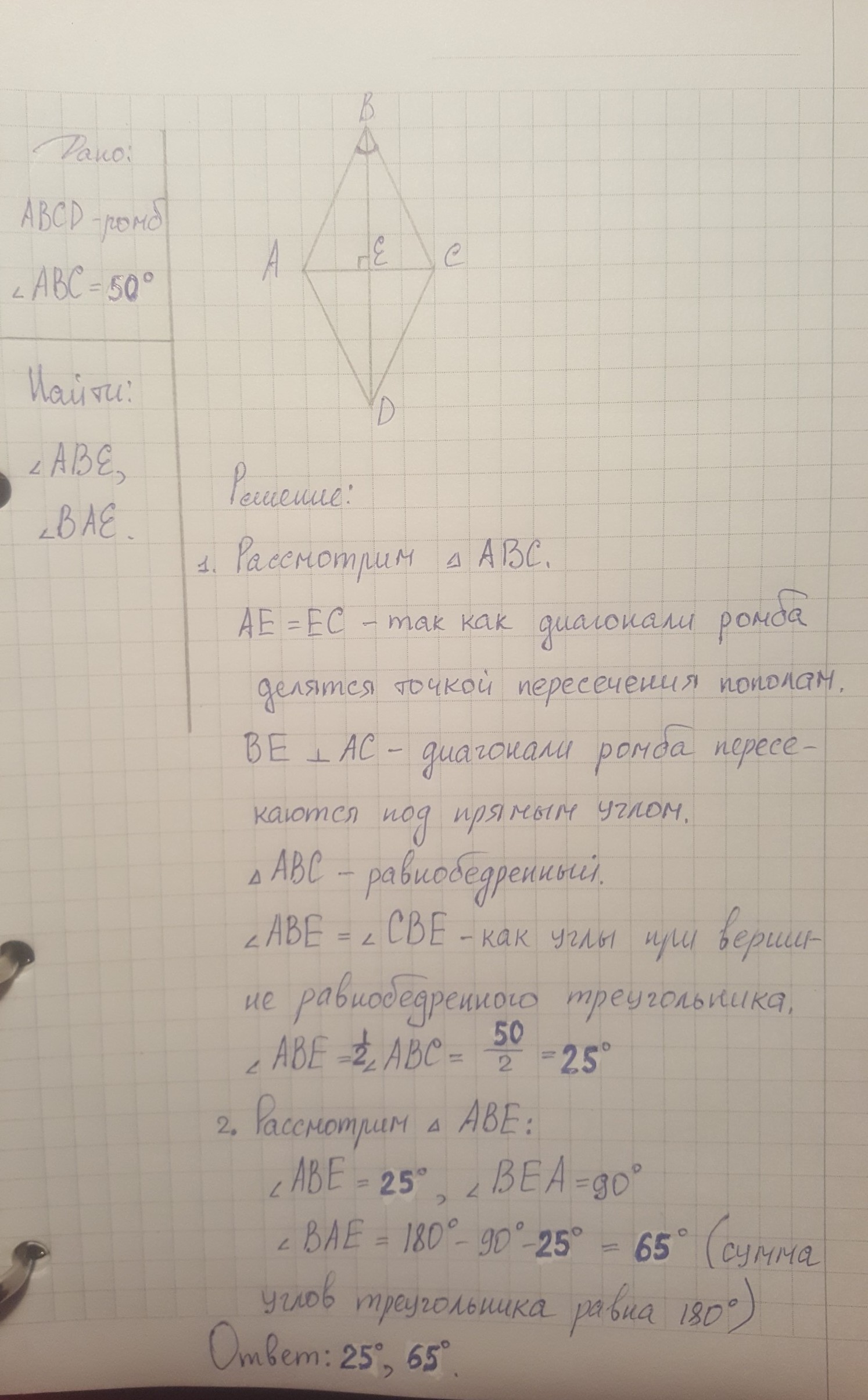 вычислите углы которые образует диагональ ромба с его сторонами если один из углов ромба равен 50