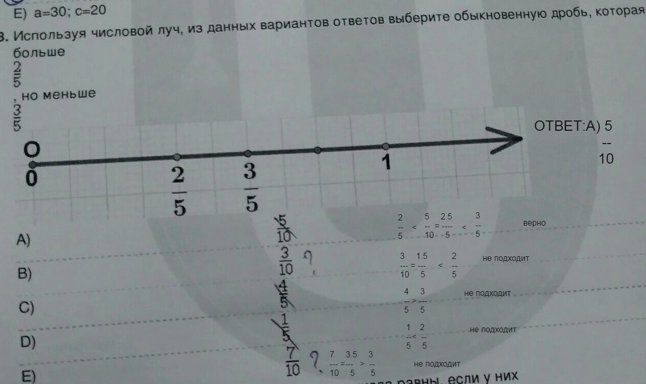 между 2/5=4/10 и 3/5=6/10 находится дробь 5/10. но тут требуют найти именно на оси. ставим точку МЕЖДУ 2/5 и 3/5 . считаем число клеточек = 5. а всего в 1 10клеточек. значит искомая дробь 5/10