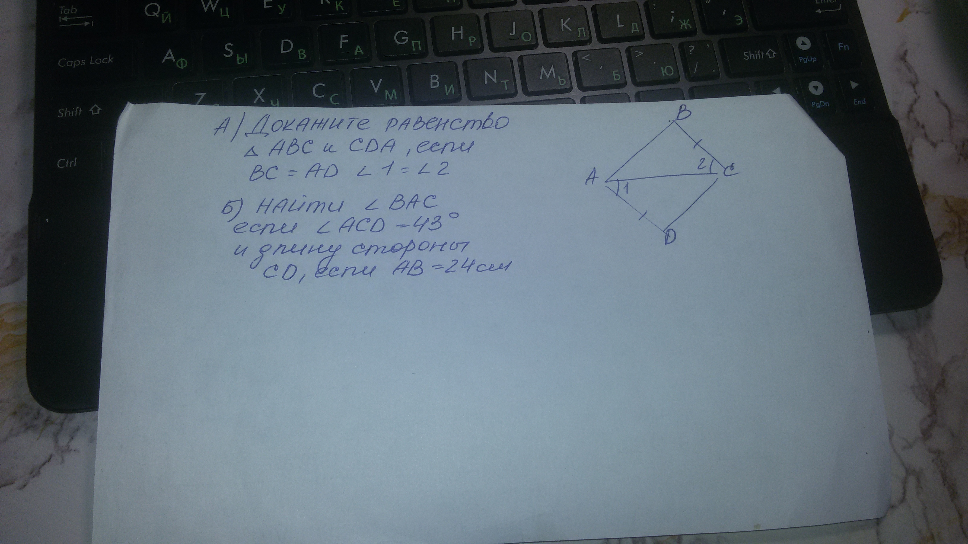 A.) так как угол DAC равен углу BCA, сторона AB равна стороне BC а AC Общая треугольники равны по двум сторонам и углу между ними. Б.) угол BAC равен угла ACD равен 43 градуса так как треугольники равны, СD равно АВ равно 24 см так как Треугольники равны
