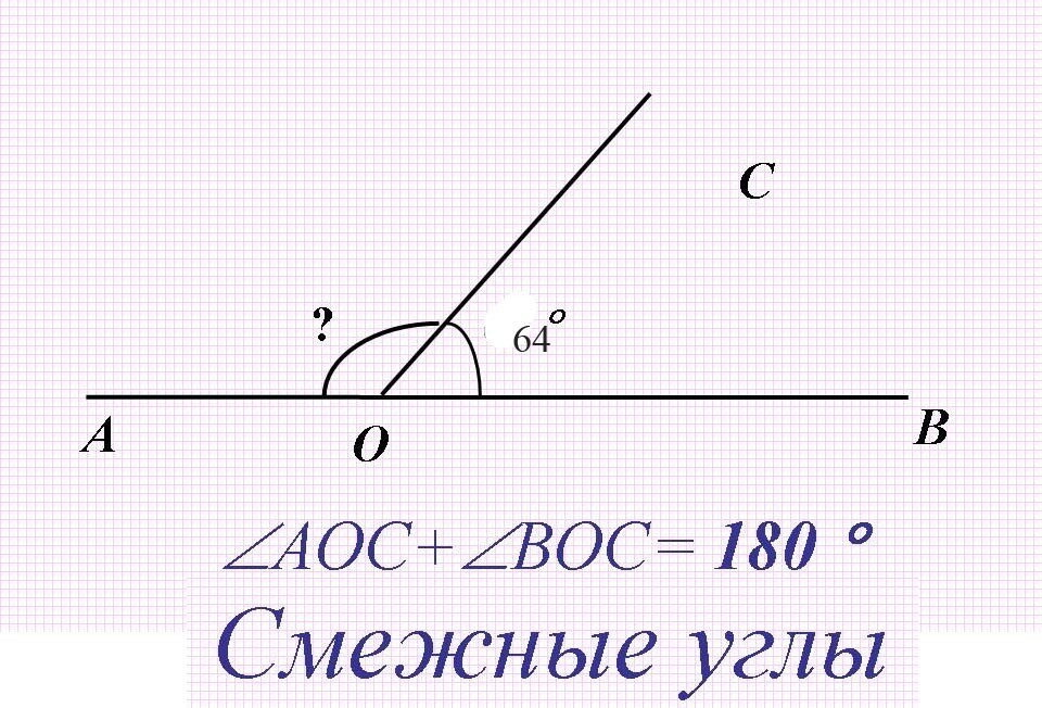 с помощью транспортира начертите угол равный 64° и проведите биссектрису смежного с ним угла