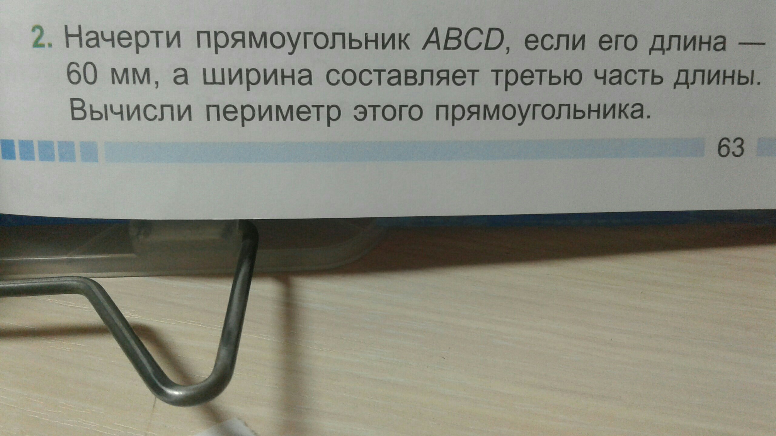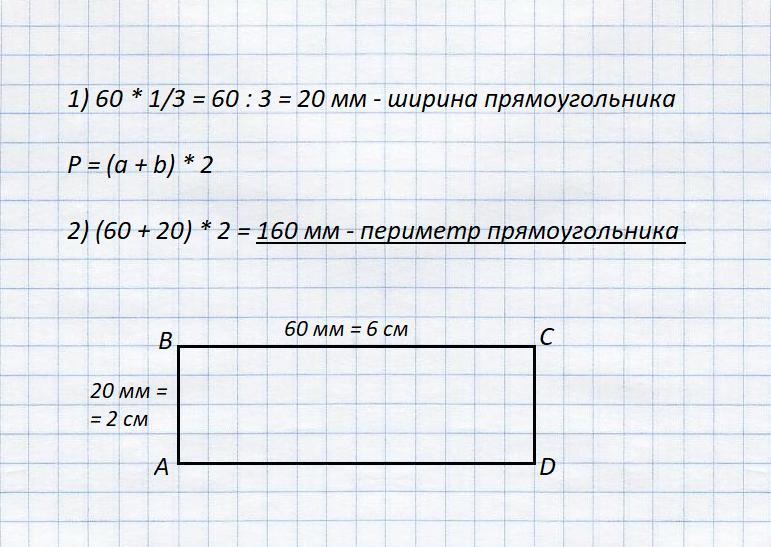 Начерти прямоугольник ABCD,если его длина 60мм,а ширина составляет третью часть длины. Вычисли периметр этого прямоугольника