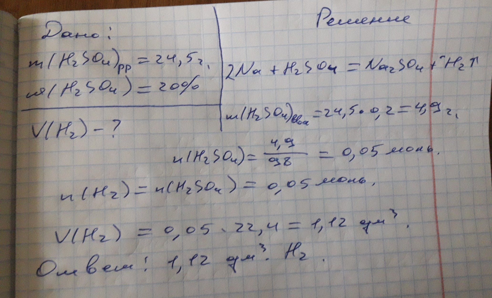 Какой объём водорода (н.у.) выделится при взаимодействии натрия с 24,5 г 20% -ного раствора серной кислоты?