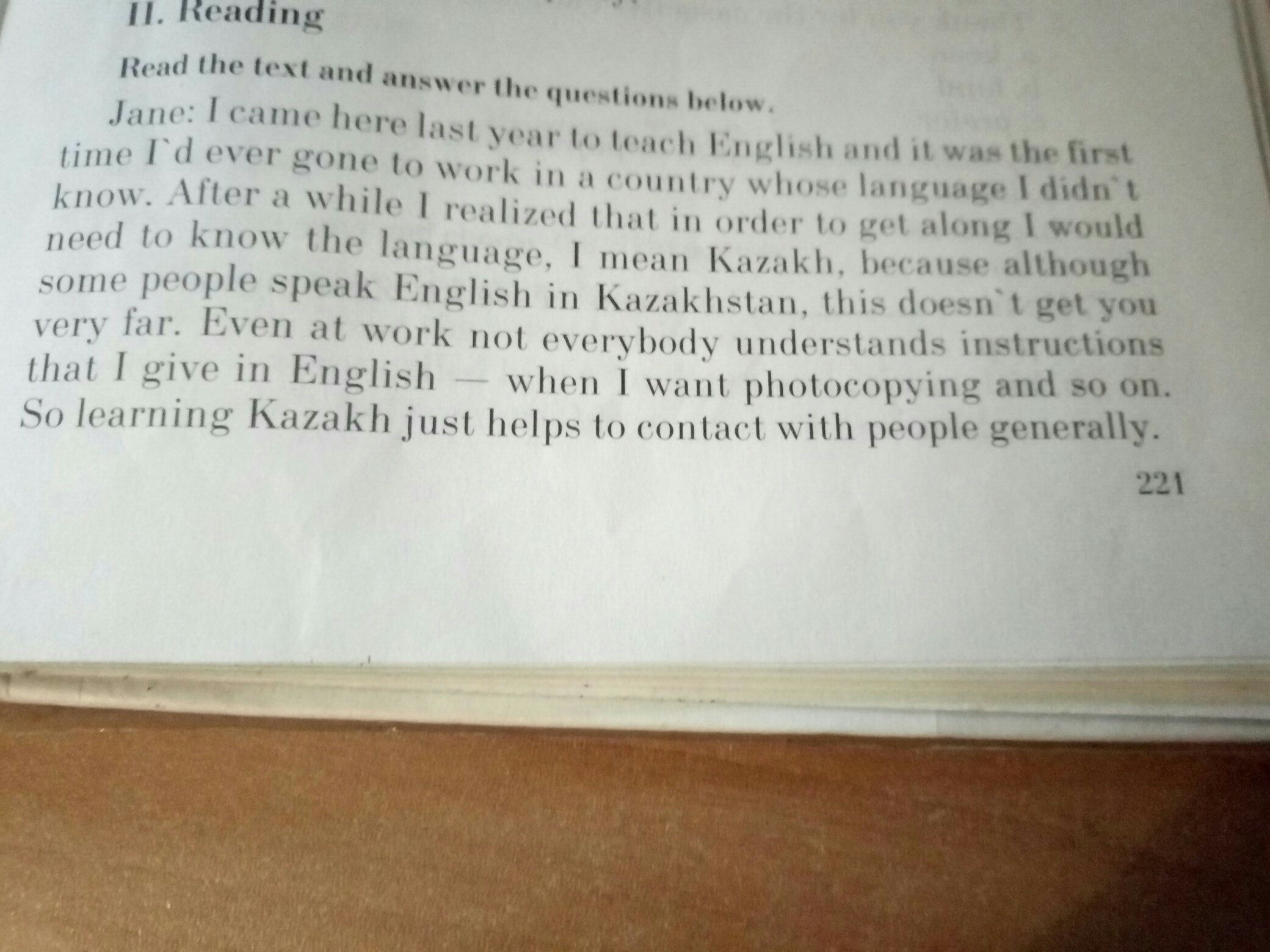 ПЕРЕВОД Прочитайте текст ответьте на вопросы: Джейн: Я приехала сюда в прошлом году, чтобы учить английский, и это был первый раз, когда я когда-либо работал на континенте, язык которого я не знал. Через некоторое время я понял, что для того, чтобы ужиться, мне нужно было знать язык, я имею в виду казахский язык, потому что, хотя некоторые люди говорят по-английски в Казахстане, это не очень далеко. Даже на работе не все понимают инструкции, которые я даю на английском, когда я хочу фотокопирование и так далее. Так что изучение казахского языка просто помогает контактировать с людьми вообще