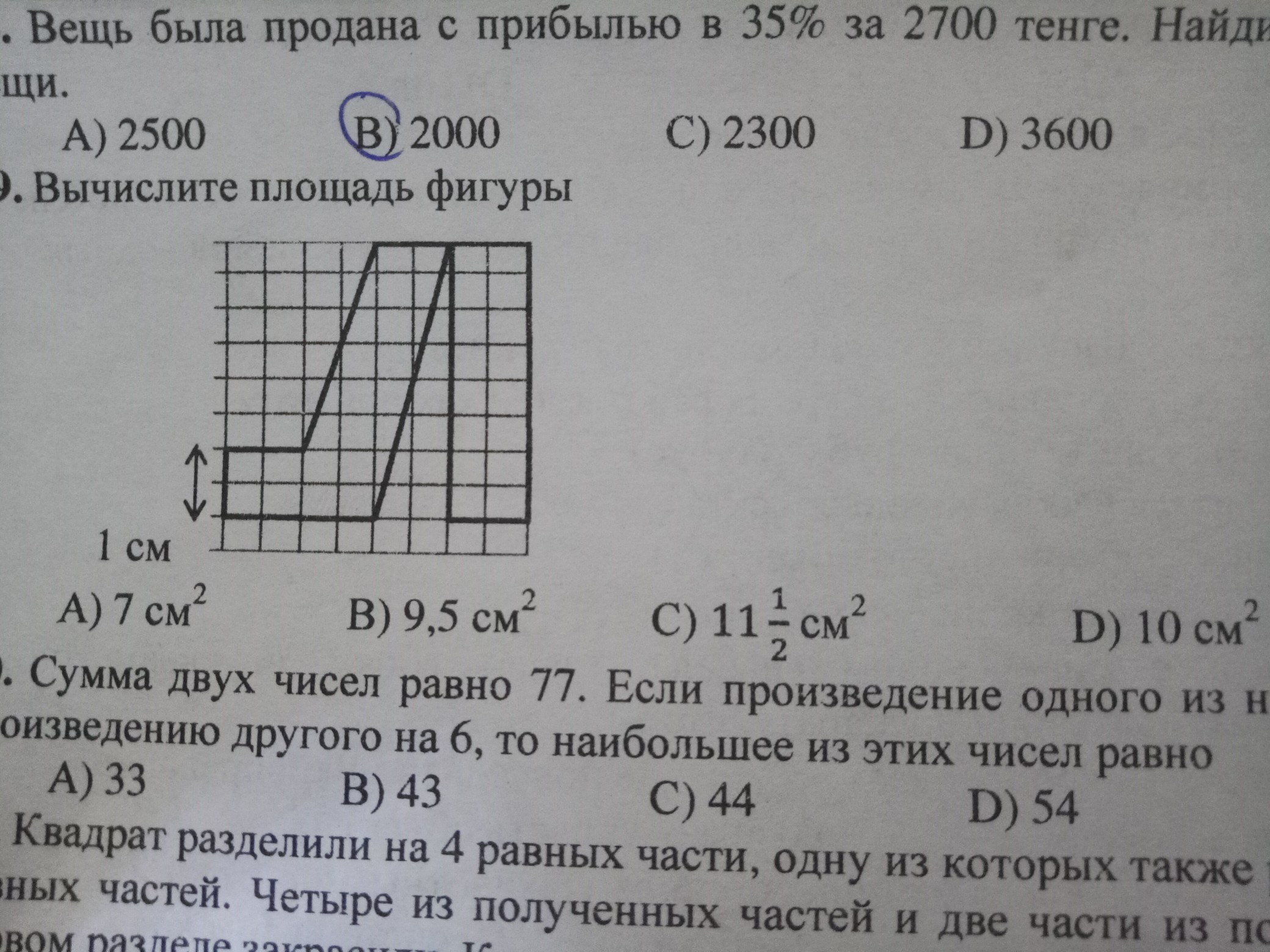 общая площадь большой (исходной )фигуры будет равна сумме площадей всех фигур. S=s1+s2+s3+s4+s5=8+6+4+4+16=38(вклетках)в сантиметрах квадратных 38/4=9.5