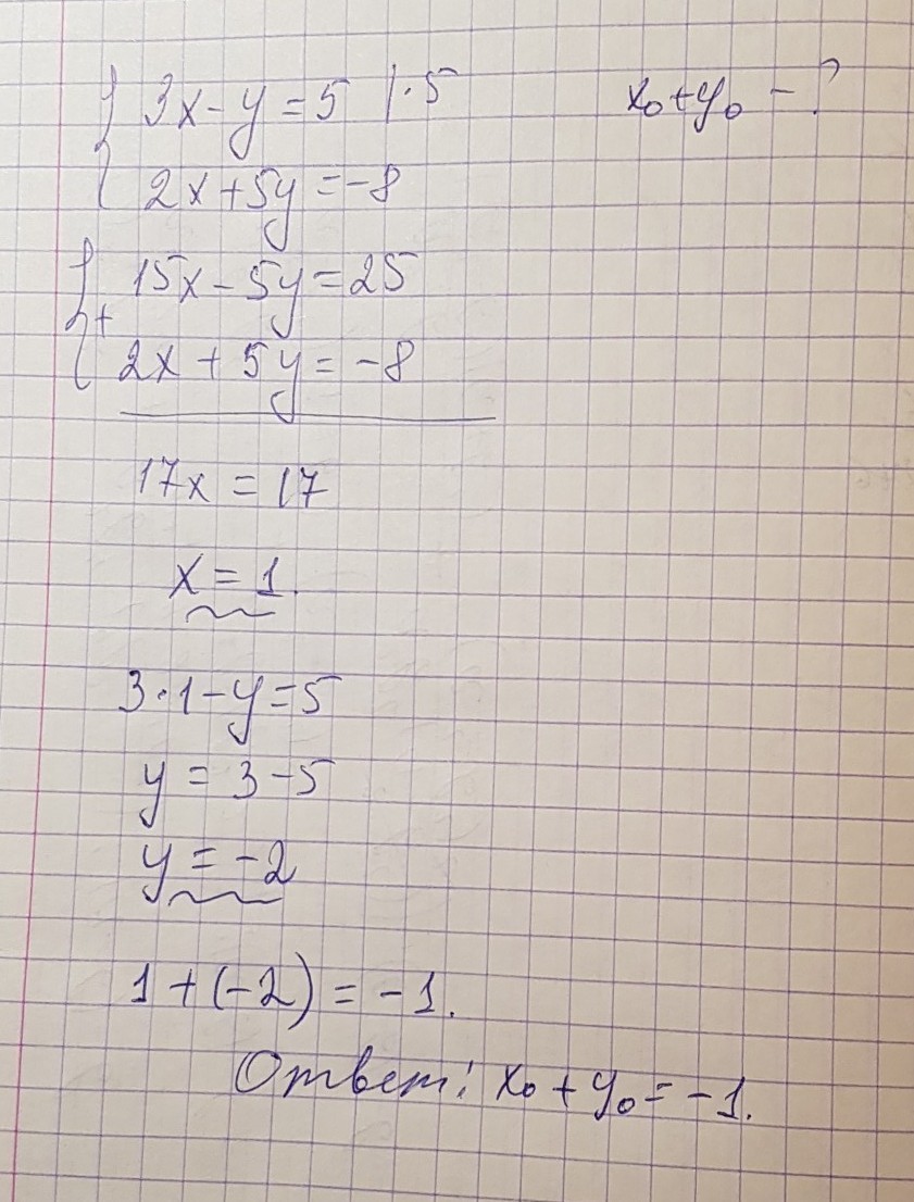 Найдите Найдите значение выражен ния xo+yo если (xo:yo) - решение системы уравнение {3x-y=5 2x+5y= - 8