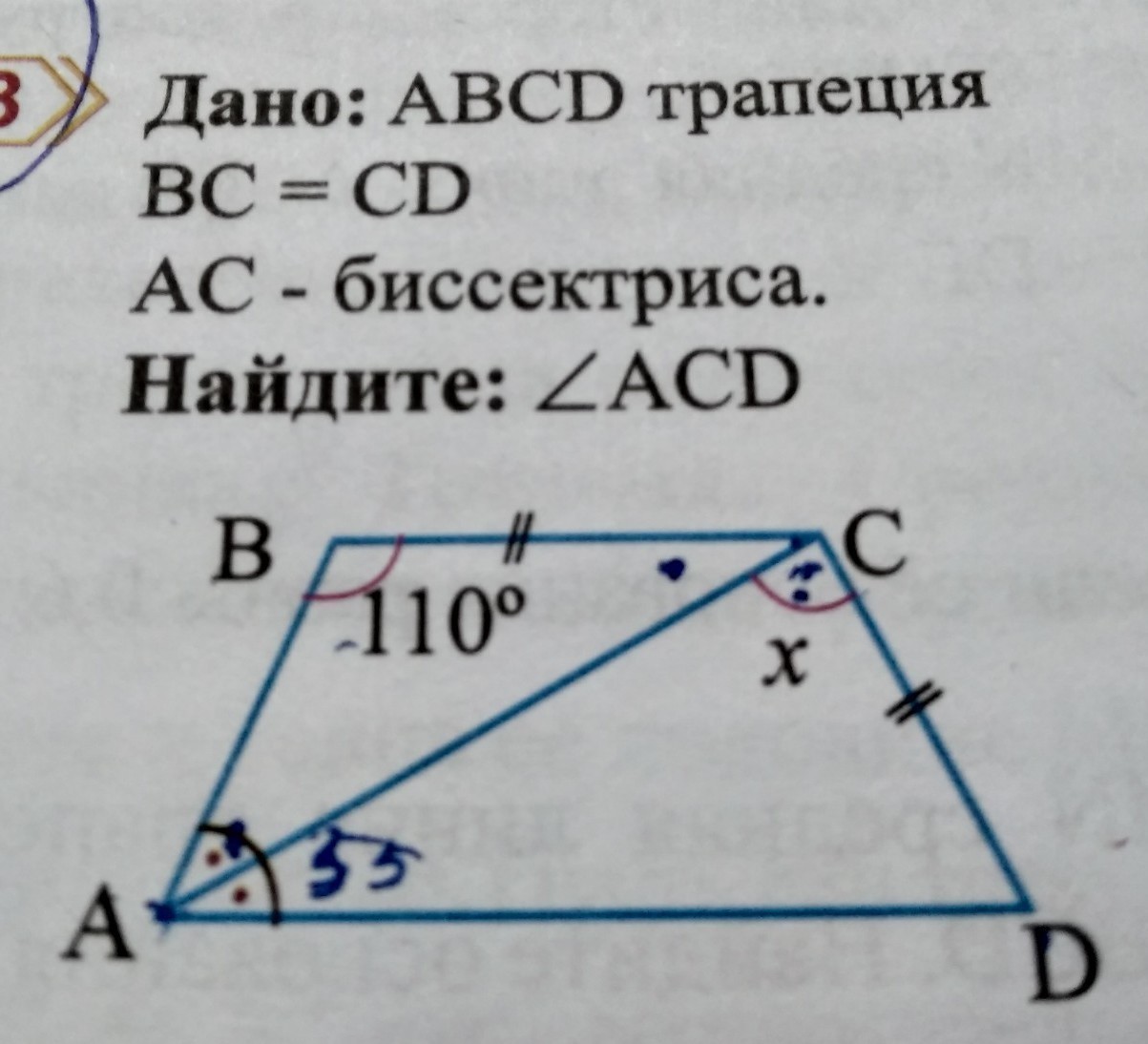 - ∠ABC+∠BAD=180°⇒∠BAD=180°-110°=70°,ЗНАЧИТ ∠СAD=∠CAB=35°