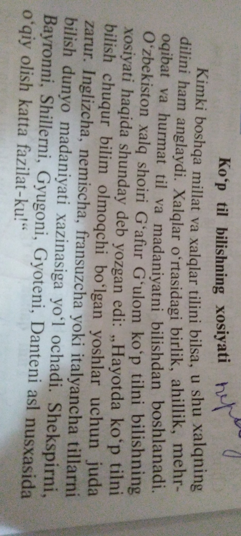 Особенность многоязычия эйч Если кто-либо знает язык других народов и народов, он также понимает народный язык. Единство, гармония, любовь и уважение между народами начинаются с знания языка и культуры. Гурум, национальный поэт Узбекистана, писал об особенностях многоязычия: «Знание многоязычия жизненно важно для молодых людей, которым нужны глубокие знания. Знание английского, немецкого, французского или итальянского языков открывает путь к сокровищнице мировой цивилизации. Очень приятно изучать Шекспира, Байрона, Шиллера, Гуго, Гете и Данте в оригинале ».