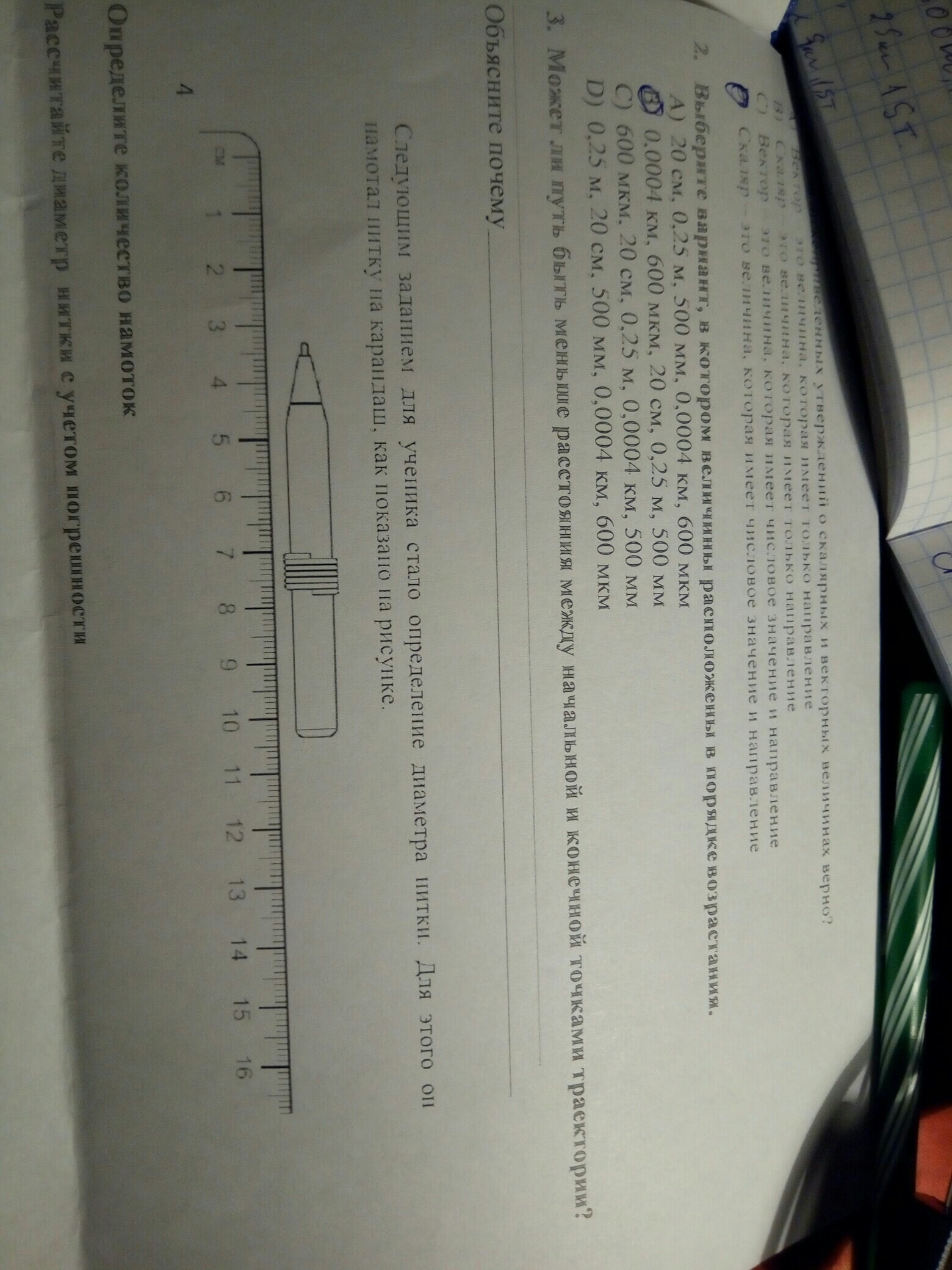 Кол-во намоток - кол-во витков проволоки. На фото видно, что их 5. Тогда диаметр проволоки равен длина всех намоток поделить на их кол-во: 0,6/5=0,12 см. Погрешность равна половине цены деления. Цена деления карандаша равна 0,1 см. Следовательно, диаметр с учетом погрешность равен 0,12+-0,05 см. Ответ: 5; 0,12+-0,05.