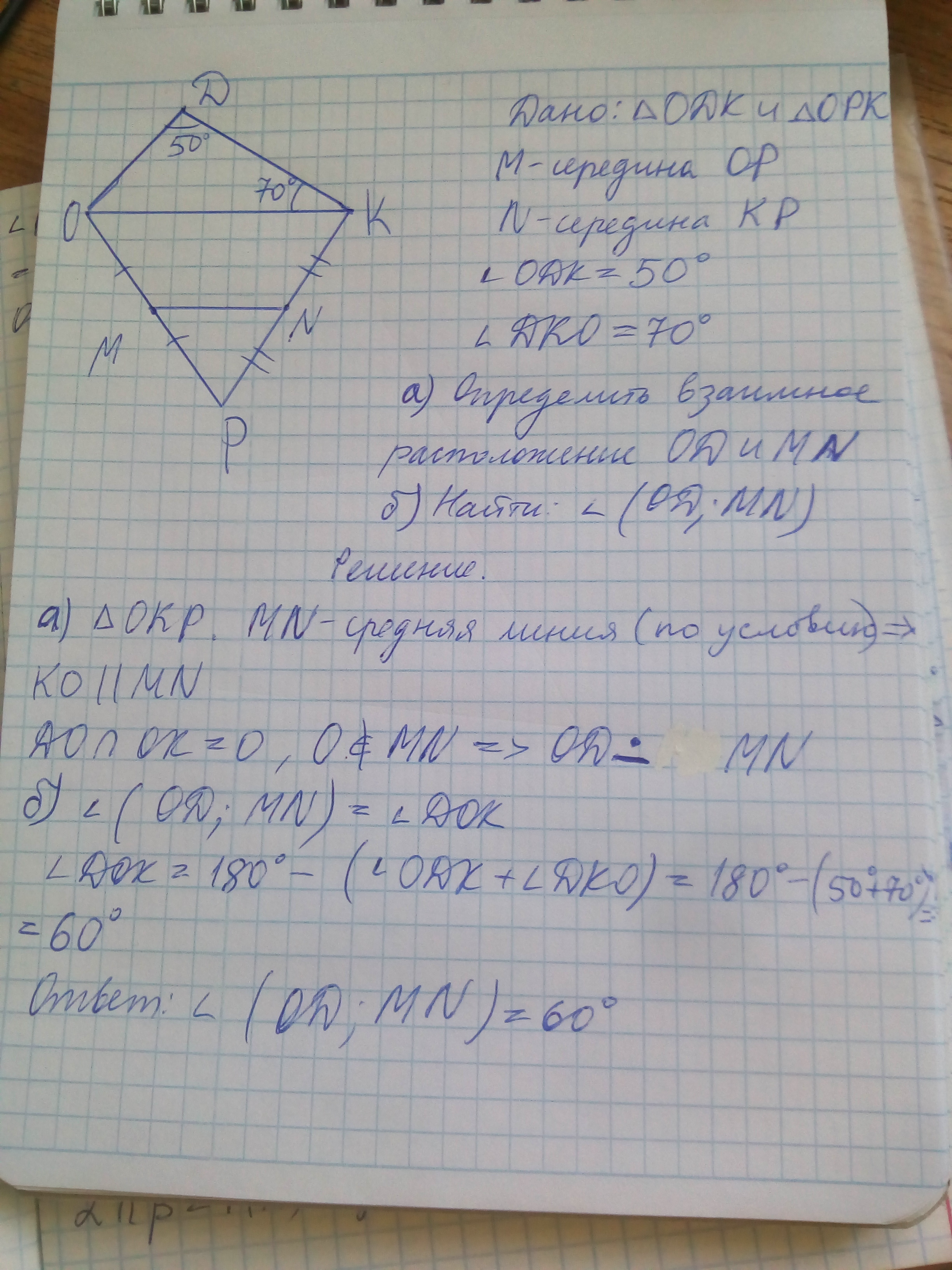 Треугольники ODK и OPK лежат В разных плоскостях и име общую сторону OK. Точка М- середина OP, точка N- середина KP. а) Каково взаимное расположение прямых OD и MN? б) Чему равен угол между прямыми OD и MN, если угол ODK=50 градусов, угол DKO=70 градусов. Ответ обоснуйте.