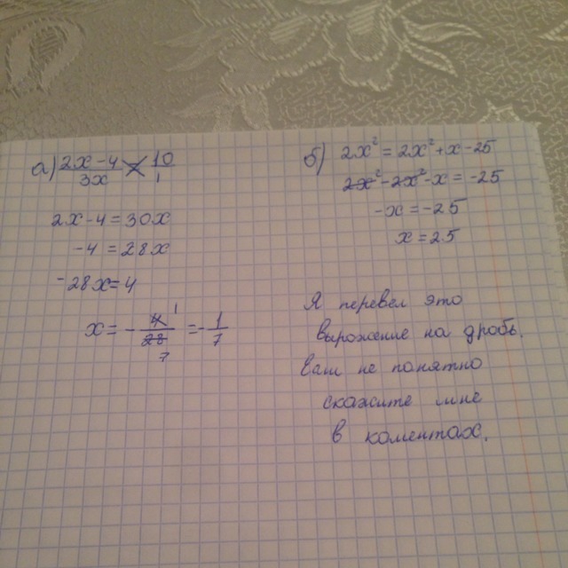 а) (2х -4)/(3х)=10 б)2х^2 = х(2х+1)-25