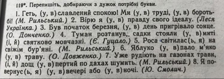 1. Геть уславлений спокою! Ми у труді, у боротьбі! 2. Вірю я в правду свого ідеалу. 3. Був початок березня, вдень пригрівало сонце. 4. Туман розтанув, садки стояли вмиті й святково мовчазні. 5. Роса світилася на свіжім бур'яні. 6. Яблуко впало м'яко в траву. 7. Уже рудіють на газонах трави, і дощ упертий по дахах шумить. 8. Я повернусь увечері або вночі.