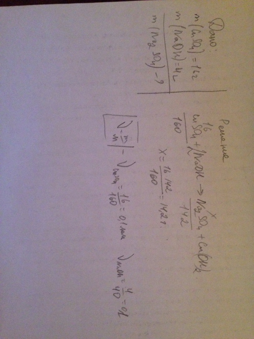 решите задачу. Определите массу соли образовавшуюся при взаимодействии 16 г сульфата меди (2) с гидрокидом натрия массой 4 г