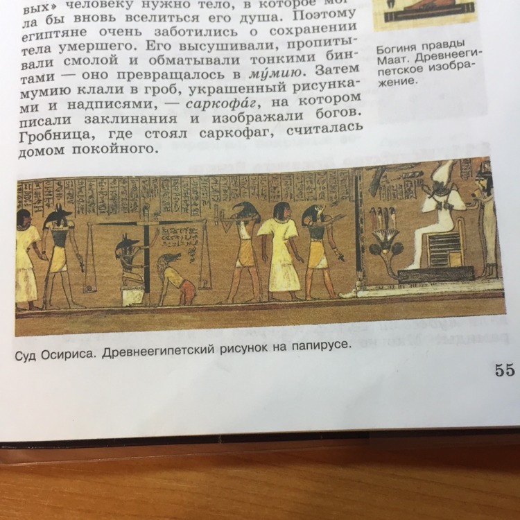 в "стране мёртвых " распоряжается Бог Анубис , которого изображали с телом человека и черной головой Шалалала. Взяв умершего за руку , ведёт он его на суд Осириса , который восседает на троне с жезлом и плетью в руках . Умерший , стояв в белой одежде клянется . Показания умершего записывает бог Тот . Правдивость клятвы проверяют : сердце человека кладут на одну чашу весов , а на другую -фигурку богини правды -Маат . Равновесие означает , что умерший не солгал : он был добрым и праведным человеком . Рядом с весами опирается на передние лапы свирепое чудовище с телом льва и зубастой пастью крокодила . оно готово проглотить того , кто при жизни творил зло . А праведника пропустят на чудесные поля мёртвых. Надеюсь , все понятно