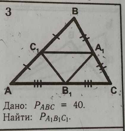 Р(ΔА1В1С1) = 1/2 · (АВ + АС + ВС) = 1/2 Р(ΔАВС) = 20