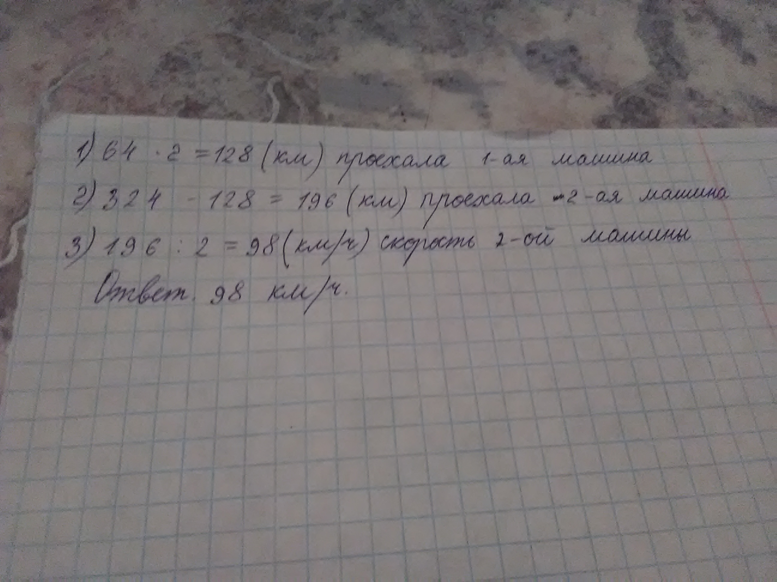 Из двух городов,расстояние между которыми 324 км,одновременно навстречу друг другу выехали две машины и встретились через 2 часа. Скорость одной машины 64 км/ч. Найдите скорость второй машины.
