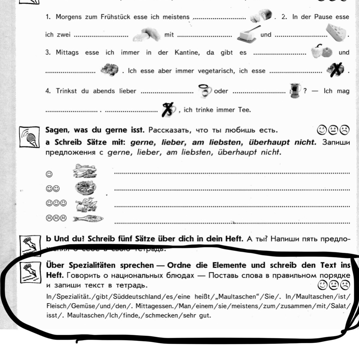 In Süddeutschland gibt es eine Spezialität. Sie heißt "Maultaschen". In den "Maultaschen" ist Fleisch und Gemüse. Man isst sie meistens zusammen mit Salat. Ich finde, die Maultaschen schmecken gut.