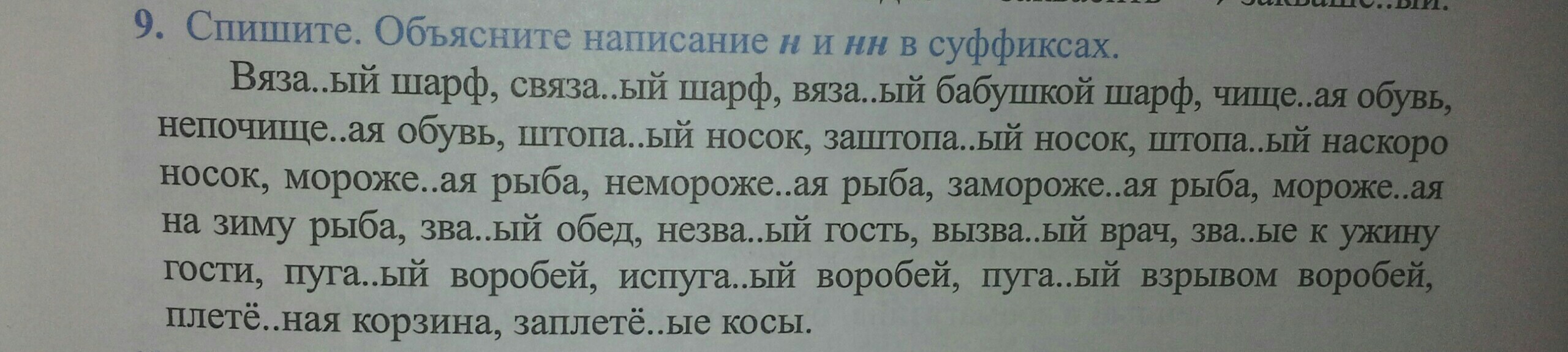 Вязаный шарф, связанный шарф, вязанный бабушкой шарф, чищеная обувь, нечищеная обувь, штопаный носок, заштопанный носок, штопанный наскоро носок, мороженая рыба, немороженная рыба, мороженная на зиму рыба, званый обед, незваный гость, вызванный врач, званные к ужину гости, пуганый воробей, испуганный воробей, пуганный взрывом воробей, плетёная корзина, заплетённые косы.