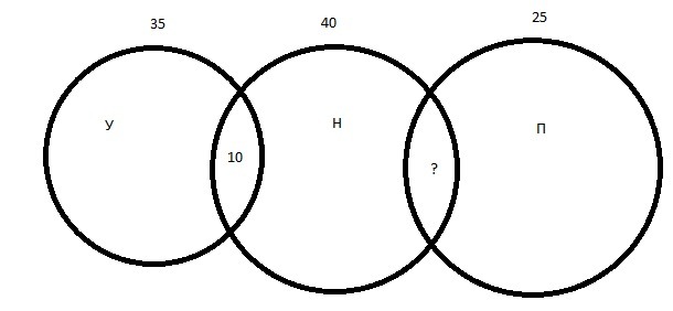 Раз У и П не имеют пересечений, можем избавиться от всех запросов содержащих У: чистое и те 10, что пересекаются с Н - останется 70 - 35 = 35 запросов. Это будет (Н' | П)