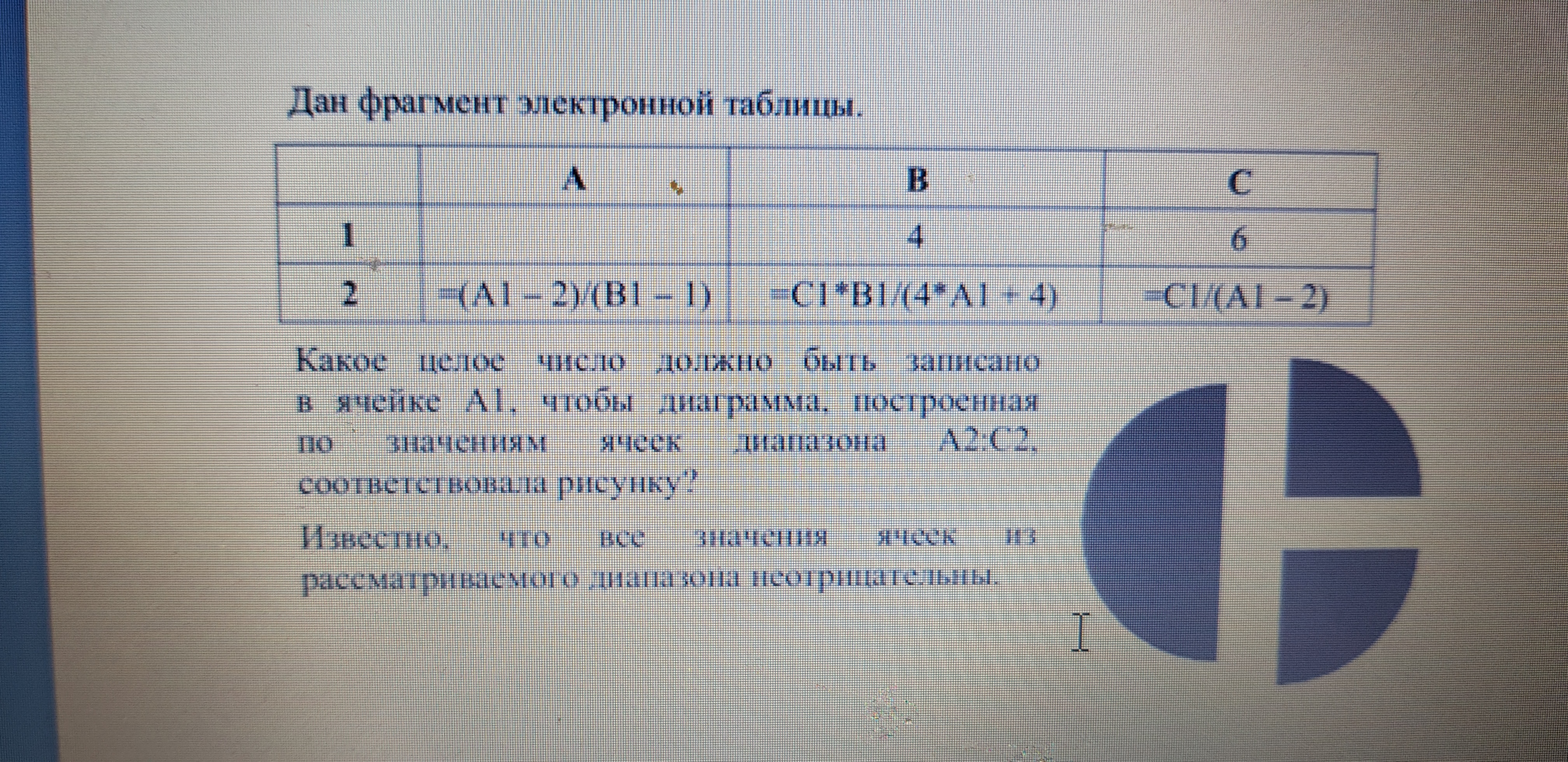 Не ясно, какая из ячеек второй строки какой частью диаграммы является. Понятно только одно: две из них равны, и их сумма равна третьей. В принципе, тут не сложно перебрать.