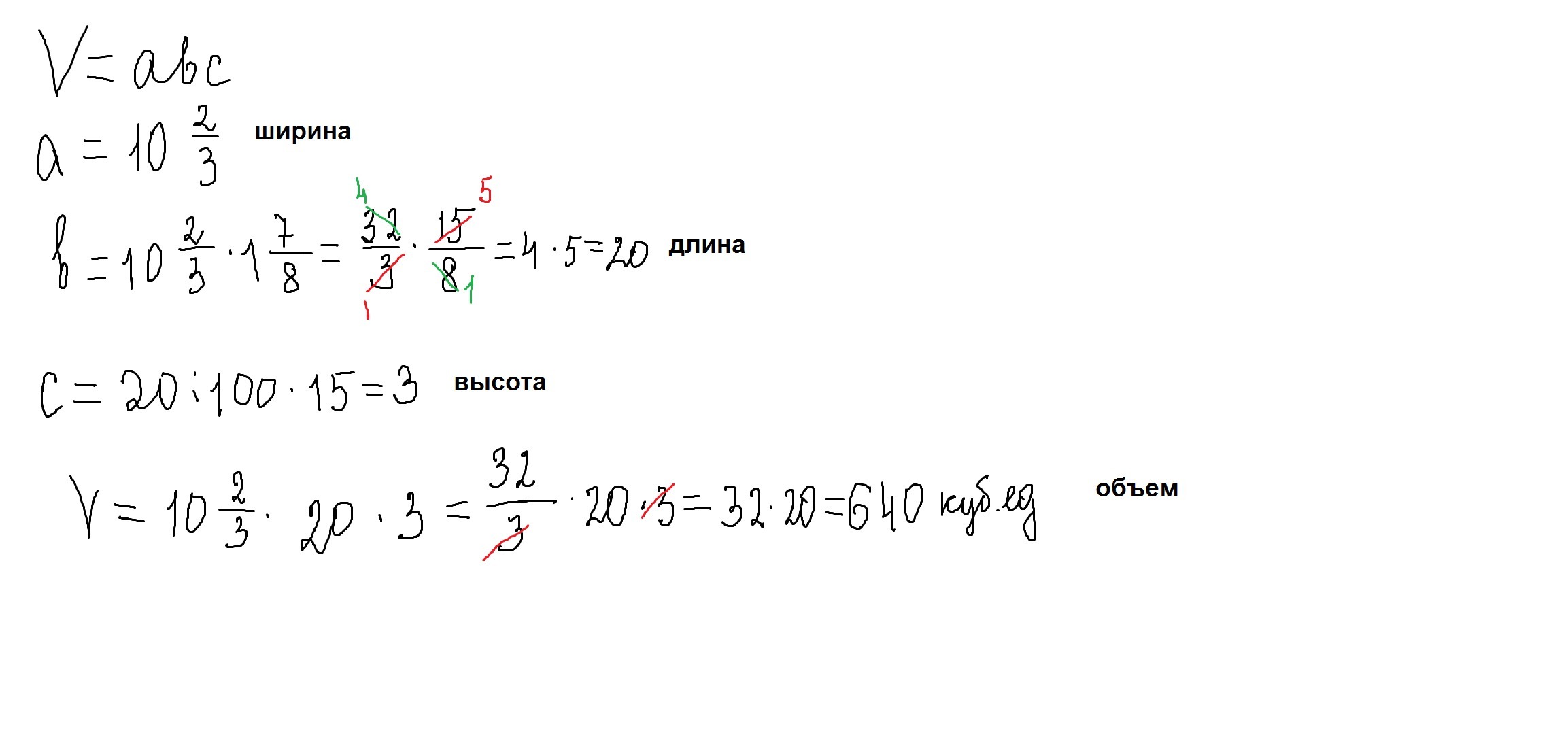 Ширина прямоуго параллелепипеда равна 10 целых 2/3. А его длина в 1 целую 7/8раза больше ширины ,а высота составляет 15% длины .Вычеслите объем его