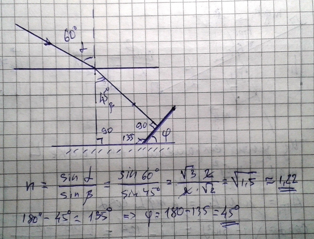 Кут падіння вузького пучка світла на поверхню рідини дорівнює 60°, а кут заломлення - 45°. Знайдіть показник заломлення рідини. Під яким кутом до горизонту слід розмістити в рідині плоске дзеркало, щоб відбитий пучок повернувся до джерела світла?