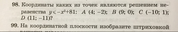 Например точка B (9;0) берём и подставляем в неравенство получается 0=<(-8)^2+81