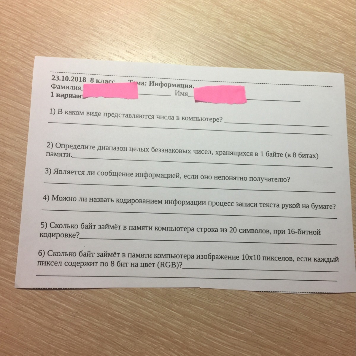 6) Всего в изображении содержится 10 * 10 = 100 пикселей, а в каждом пикселе 8 * 3 = 24 бит, так как на пиксель приходится 3 цвета: красный, зелёный, синий. Значит всего байт выходит: 100 * 24 / 8 = 300.