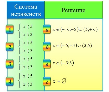 Установи соответствие между системами линейных неравенств и их решениями. Ответ запиши в виде сочетания цифр и букв, без пробелов и каких-либо знаков препинания, цифры должны идти по порядку. Например: 1а2г3а