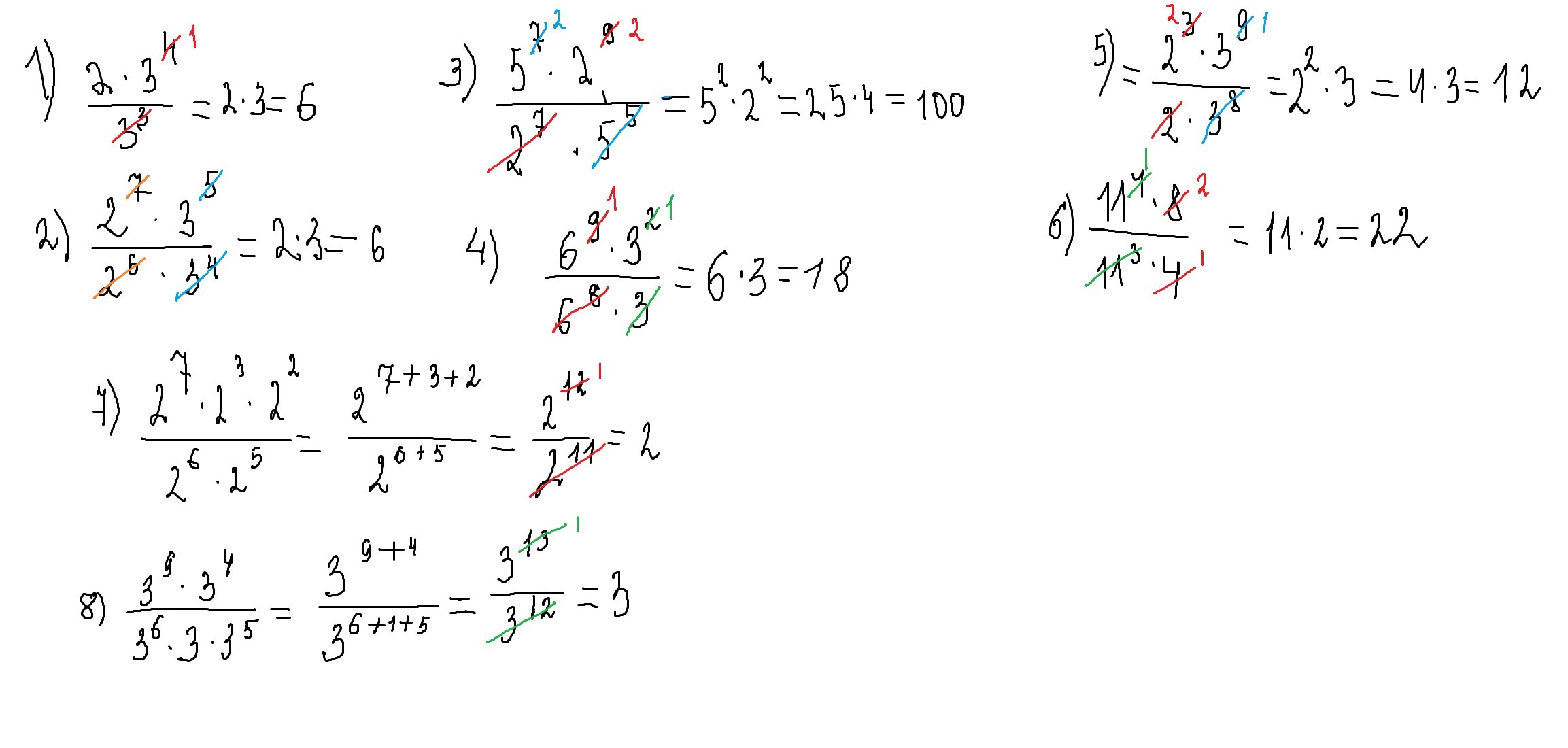 при делении степеней с одинаковыми основаниями показатели вычитаются,а при умножении-складываются.решение смотри внизу.