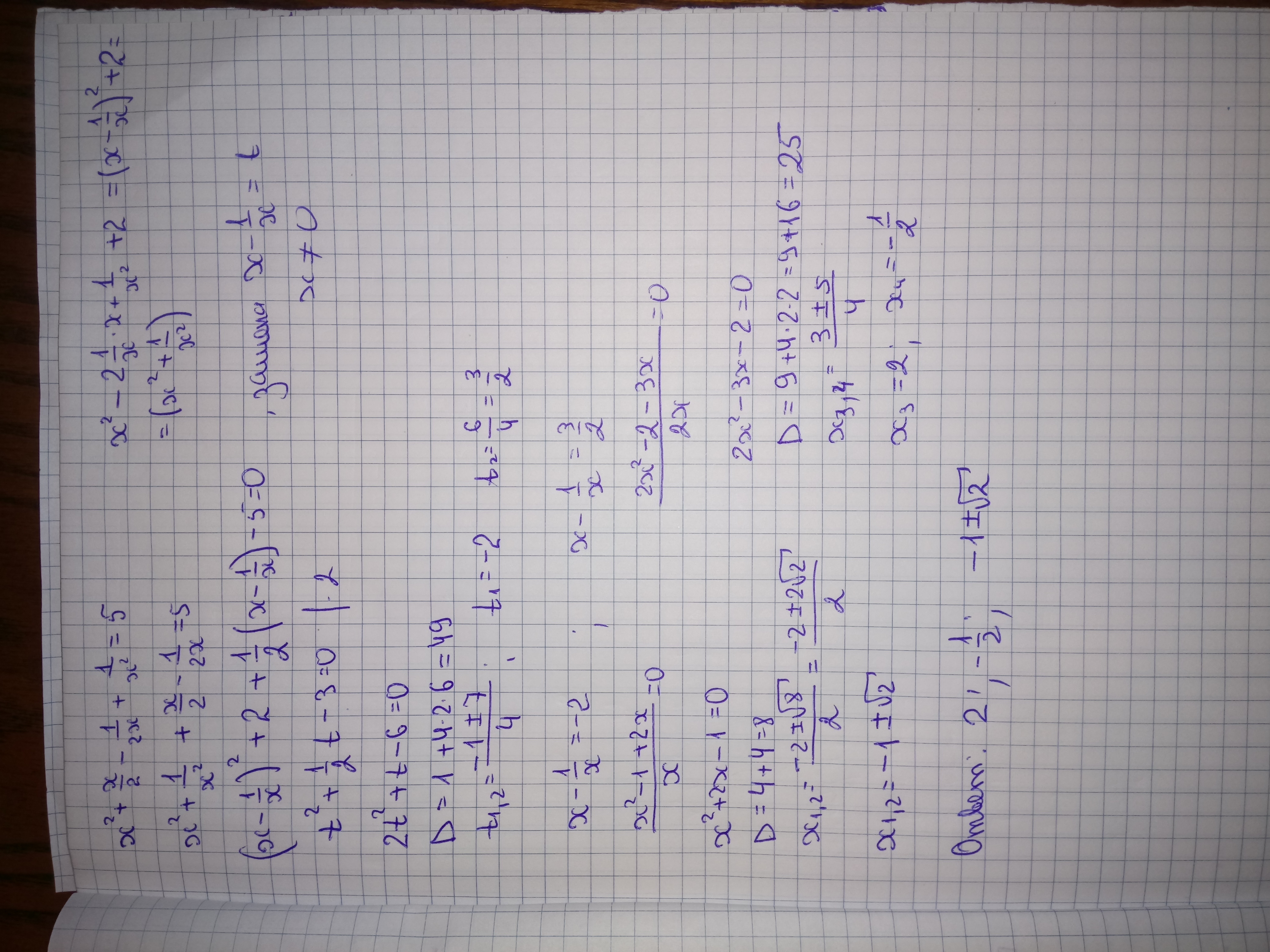 б) x - 1 / x = 3/2 2x ²- 3x -2 = 0 =0 || D =3² -4*2(-2) =5² ⇔ x = (3 ± 5)/4 .