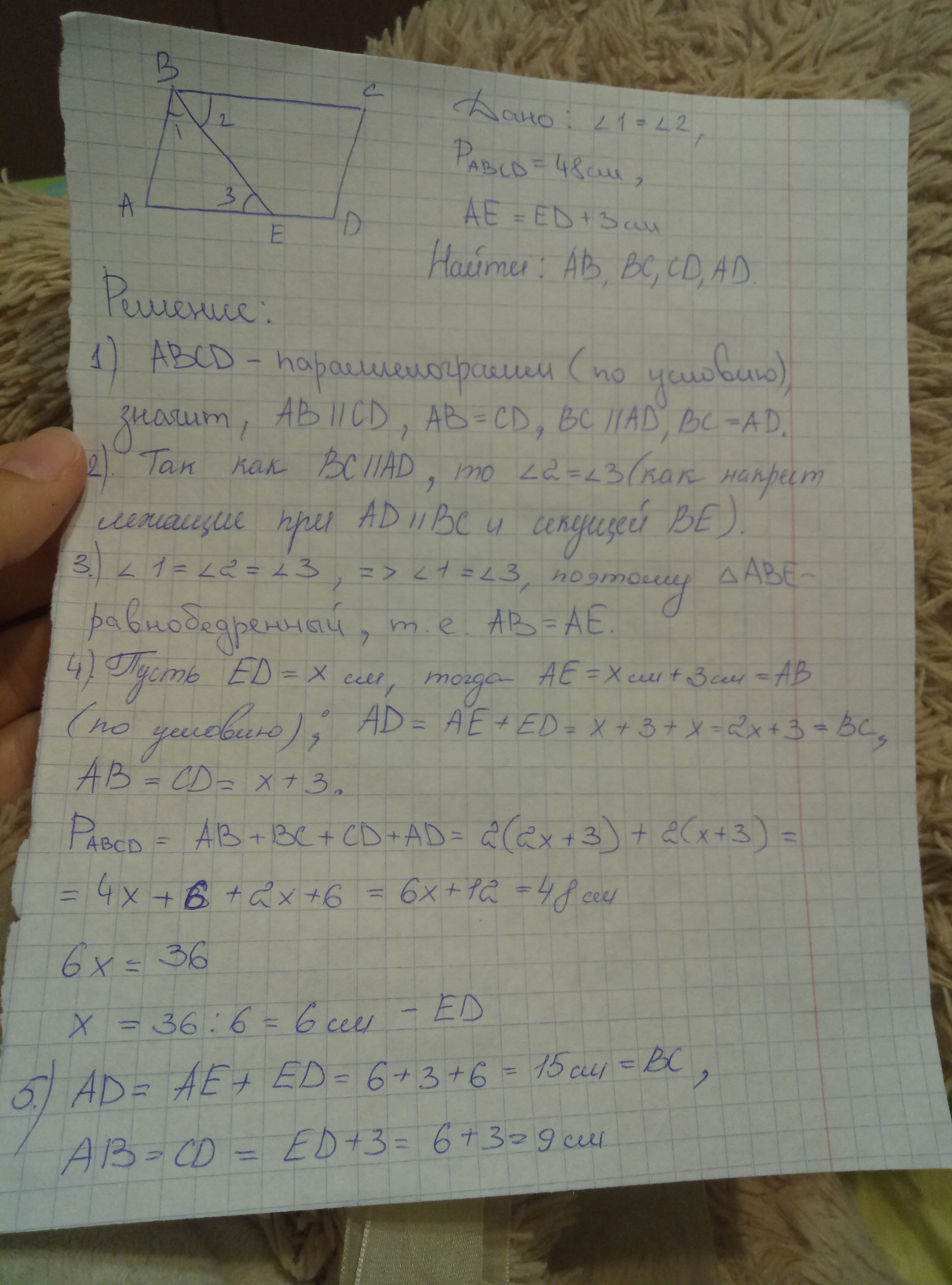 AD = AB + 3 = 12 + 3 = 15 см ,следовательно, AD = BC = 15 см