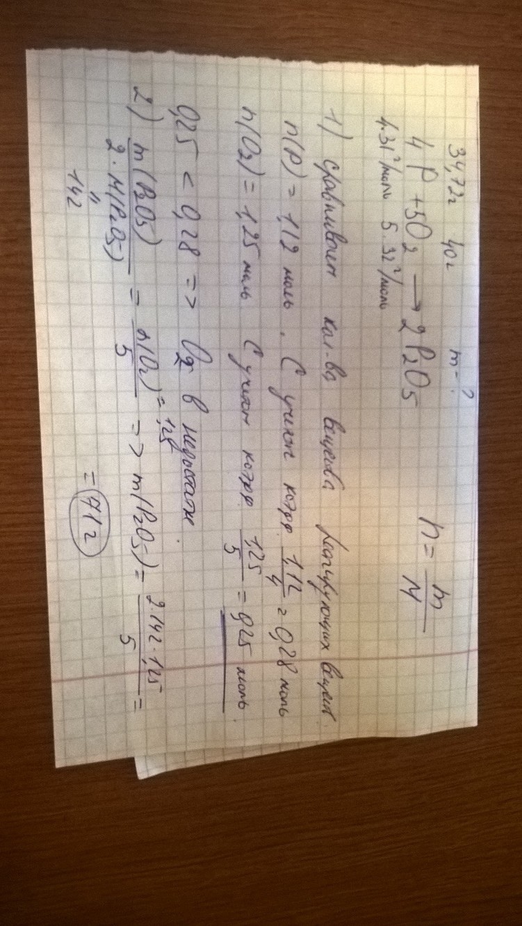 Помогмте пожалуйста. Какая масса оксида фосфора (V) образуется при взаимодействии 34,72 г фосфора и г 40 кислорода. Дам 20 баллов.