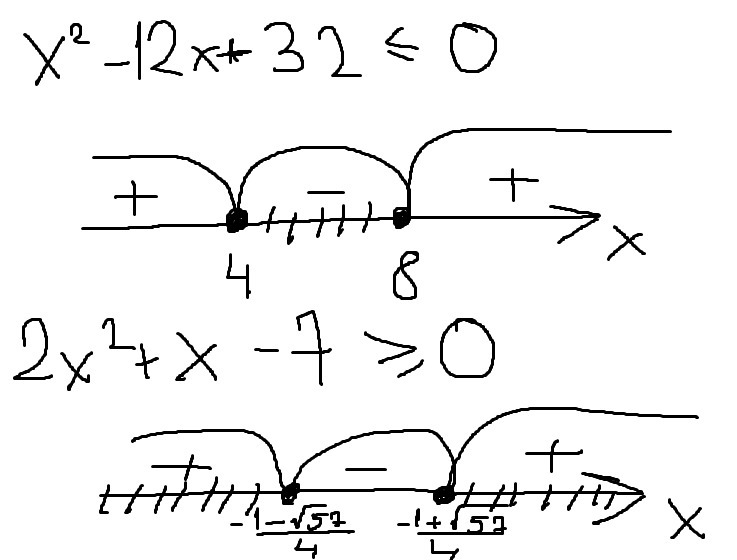 Далее наносим эти числа на числовую прямую, причем точки у этих чисел должны закрашены, потому как знак нестрогий. Далее разбиваем ее на промежутки и берем какое-нибудь контрольное число у крайнего правого промежутка, например, +100 и подставляем его в уравнение. Знак этого числа будет положительным, ставим "+". Далее отмечаем знаки остальных промежутков, просто чередуя их, то есть в промежутке от 4 до 8 будет знак "-", а от минус бесконечности до 4 "+". Смотрим на знак неравенства: число должно быть меньше нуля. Теперь смотрим на прямую и смотрим, где у нас знак "-". Ага, в промежутке от 4 до 8. Значит, в ответ так и записываем, что x∈[4;8]. Скобки квадратные, потому что знак неравенства нестрогий.