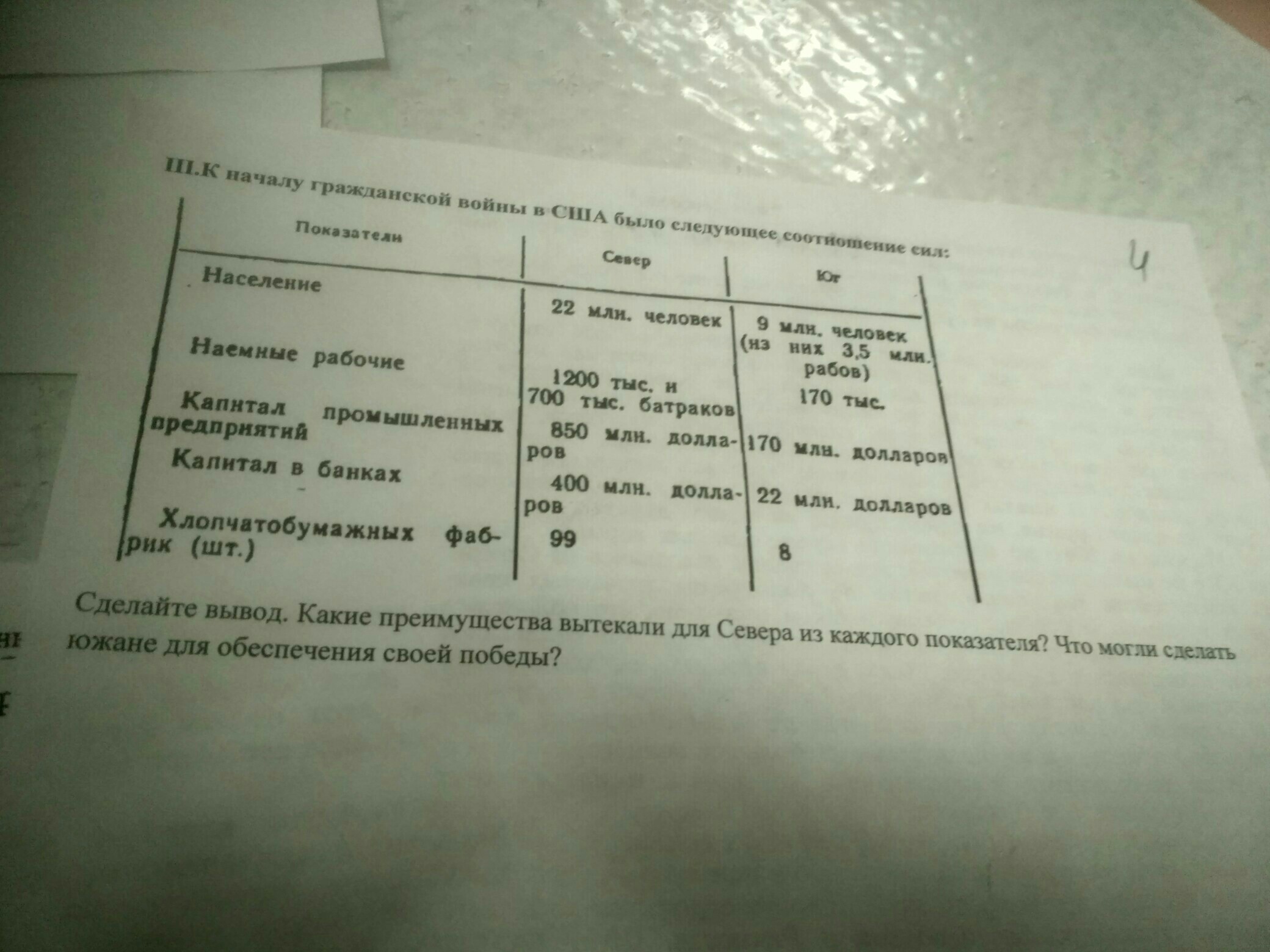 Глядя на цифры становится явным преимущество севера страны практически по всем показателям. Южане не имели достаточно человеческих ресурсов, капитала или военного производства. львиную долю населения юга составляли рабы которые не были заинтересованы в войне своих господ. Для победы юг страны мог предоставить свободу рабам, провести рекрутинговую кампанию, заключить союзы с отдельно взятыми северными штатами и заручится поддержкой с европы.