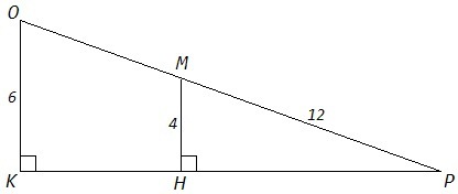Из точки M лежащий на гипотенузе OP прямоугольного треугольника OPK, опущен перпендикулярн MH на сторону PK. Найдите гипотенузу OP, если MP=12 cм, MH = 4 см, OK °6 см