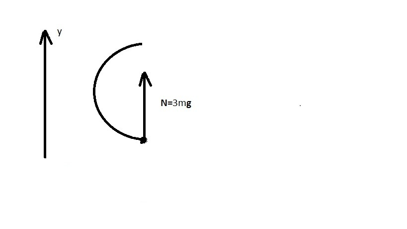 Пусть m - масса пилота, v - его скорость относительно Земли. В СО, связанной с Землёй, в нижней точке траектории на пилота действует сила реакции опоры по модулю равная весу тела 3mg. Эта сила сообщает телу центростремительное ускорение. В проекции на вертикальную ось получаем: