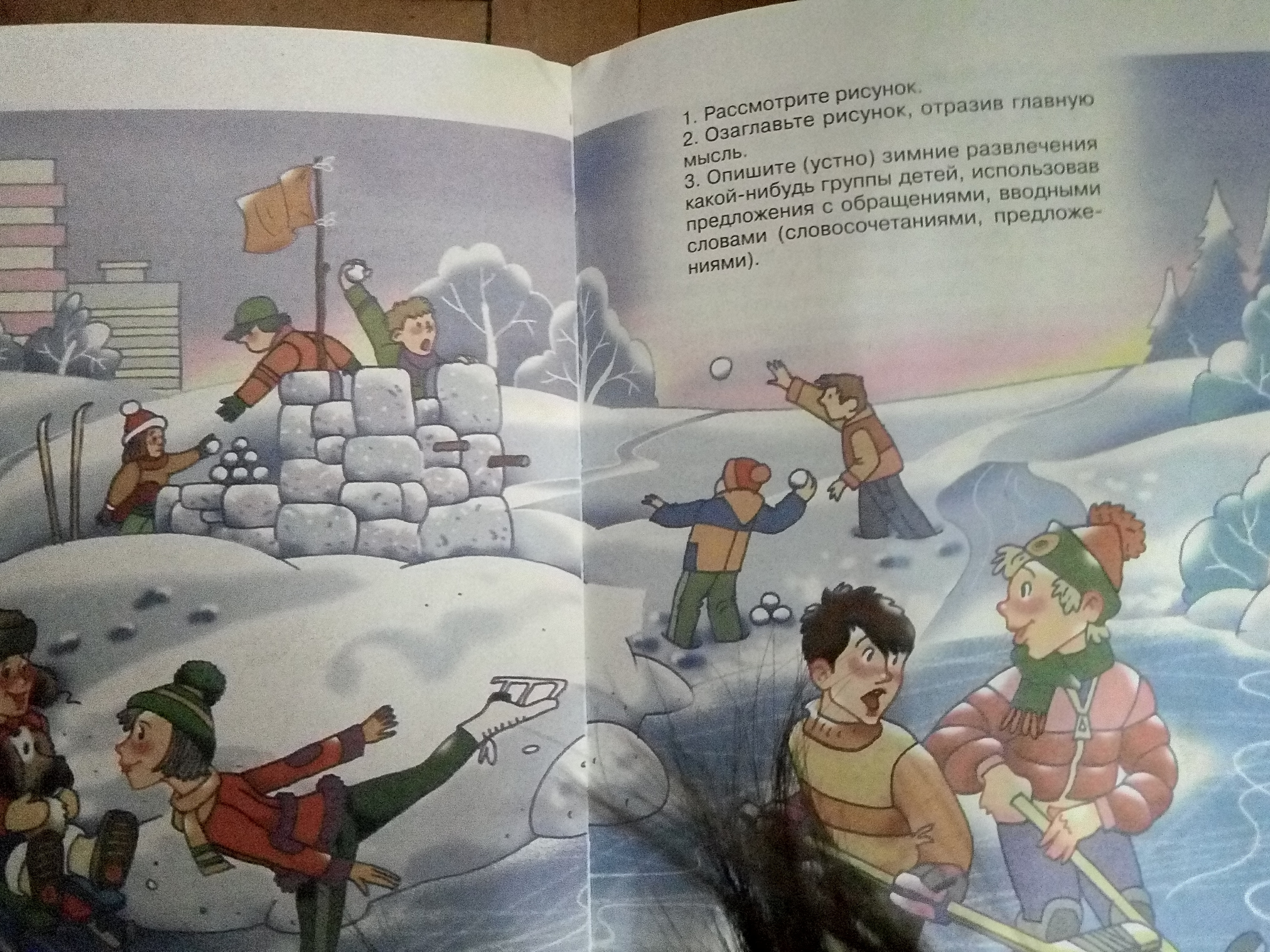 3) На данной картинке мы можем увидеть как мальчишки и девчонки играют в разные игры, например, присмотритесь, вдали мы видем 5 мальчиков, играющих в снежки.
