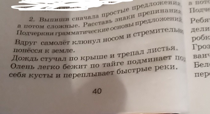 Сложные:Олень легко бежит по тайге подминает под себя кусты, и переплывает быстрые реки. Вдруг самолёт клюнул носом, и понесся к земле.