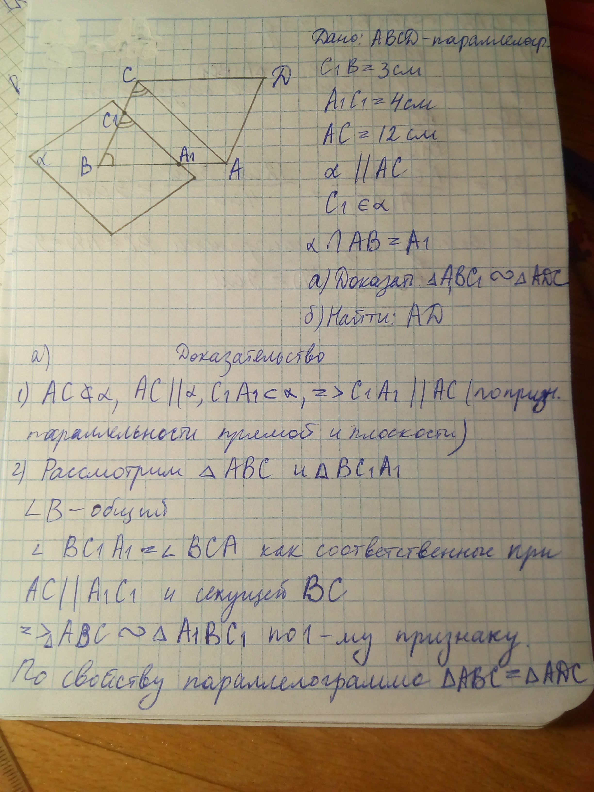 На стороне BC паралелограмма ABCD выбрана точка C1 так что C1B=3 см. Плоскость параллельная диагонали AC, проходит через C1 и пересекает сторону AB в точке А1
