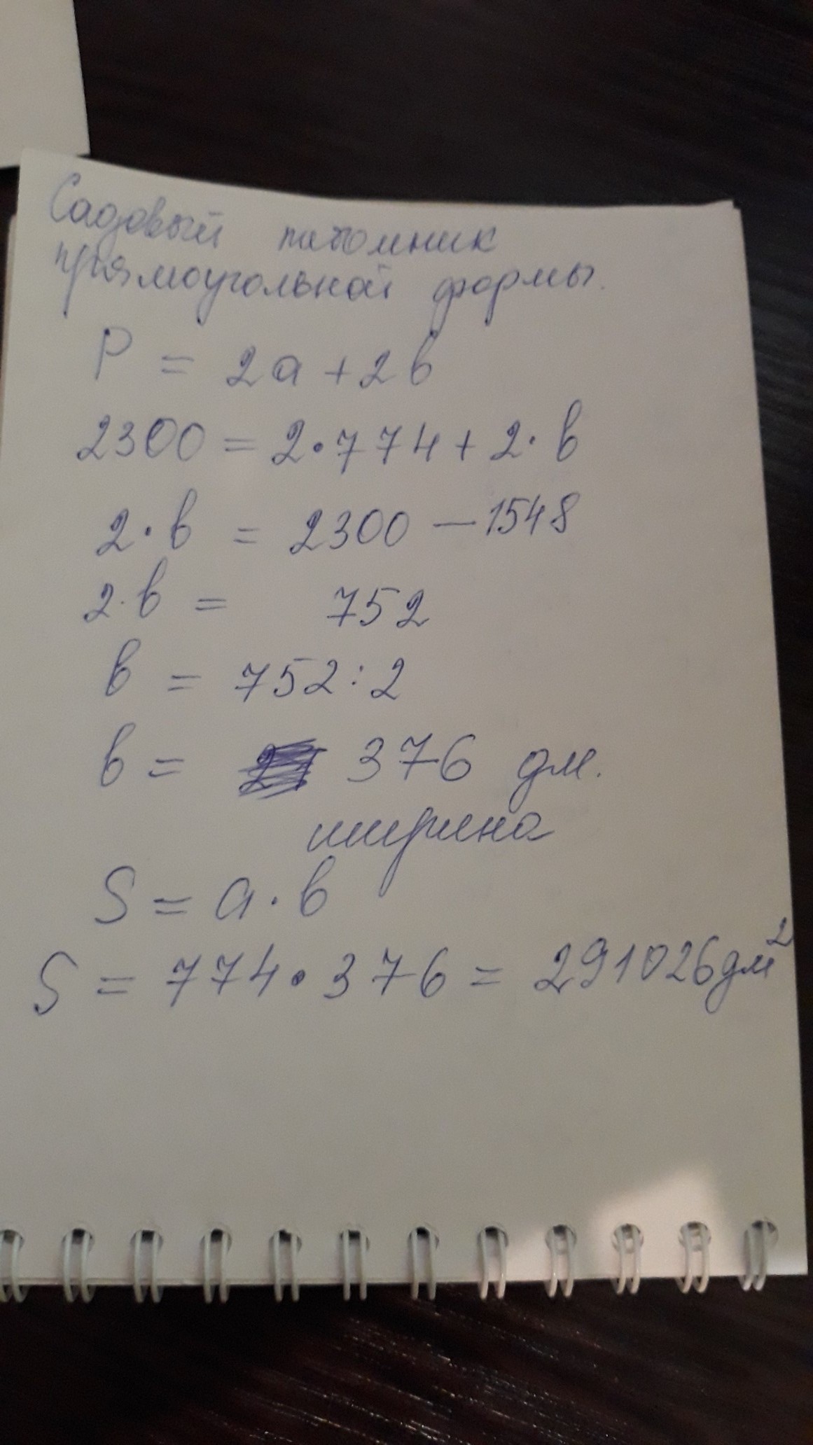 Длина садового питомника — 774 дм, его периметр — 2300 дм. Чему равна площадь садового питомника?