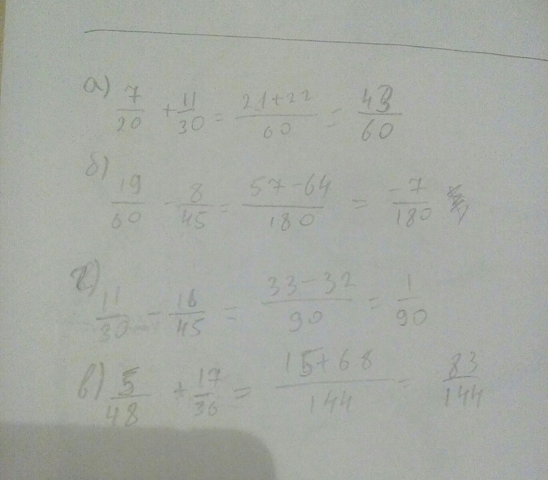а) 7/20 + 11/30 = 21/60 + 22/60 = 43/60